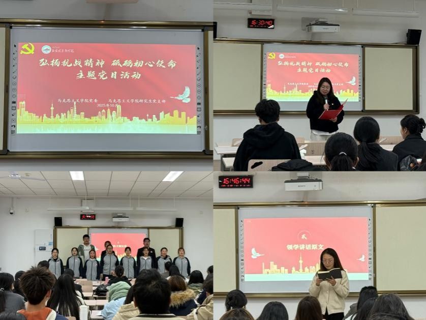 为纪念中国人民抗日战争暨世界反法西斯战争胜利80周年,弘扬伟大抗战精神,凝聚奋进磅礴力量,马克思主义公司党委于10月22日下午在五教5101教室开展“弘扬抗战精神,砥砺初心使命”主题党日活动。best365体育亚洲教工、研究生、本科生党支部全体党员参加了此次活动。活动由研究生党支部委员曹心蓉主持。