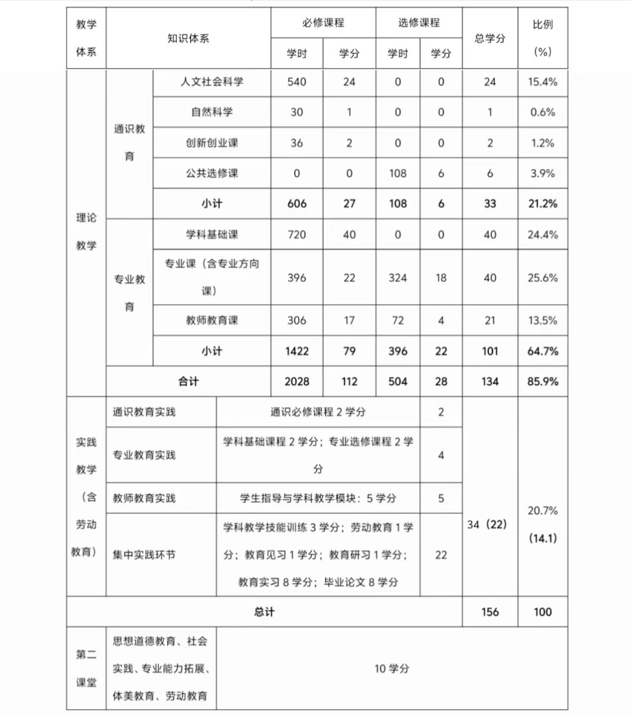 2021版本科培养方案中,公司课程结构学分统计如下表所示。