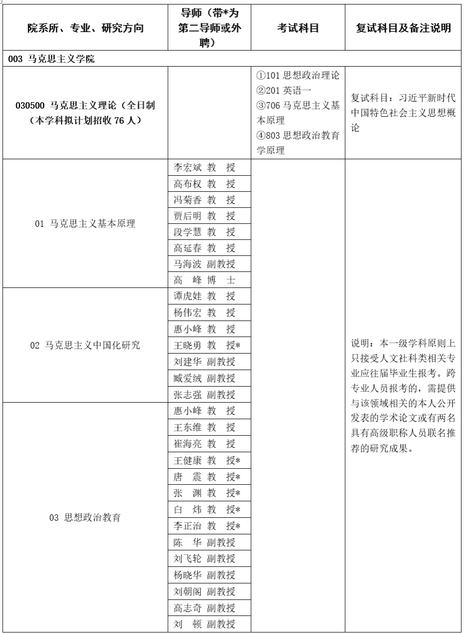 马克思主义中国化研究:马克思主义中国化研究是马克思主义理论一级学科所属的二级学科。现有专任导师7名、兼职导师1人,其中教授4人。设有毛泽东思想与近现代中国研究、邓小平理论与中国特色社会主义建设研究、马克思主义宗教理论与中国传统文化研究、社会主义和谐社会理论研究、中国共产党执政理论研究、中共党史人物与马克思主义中国化研究6个研究方向。
