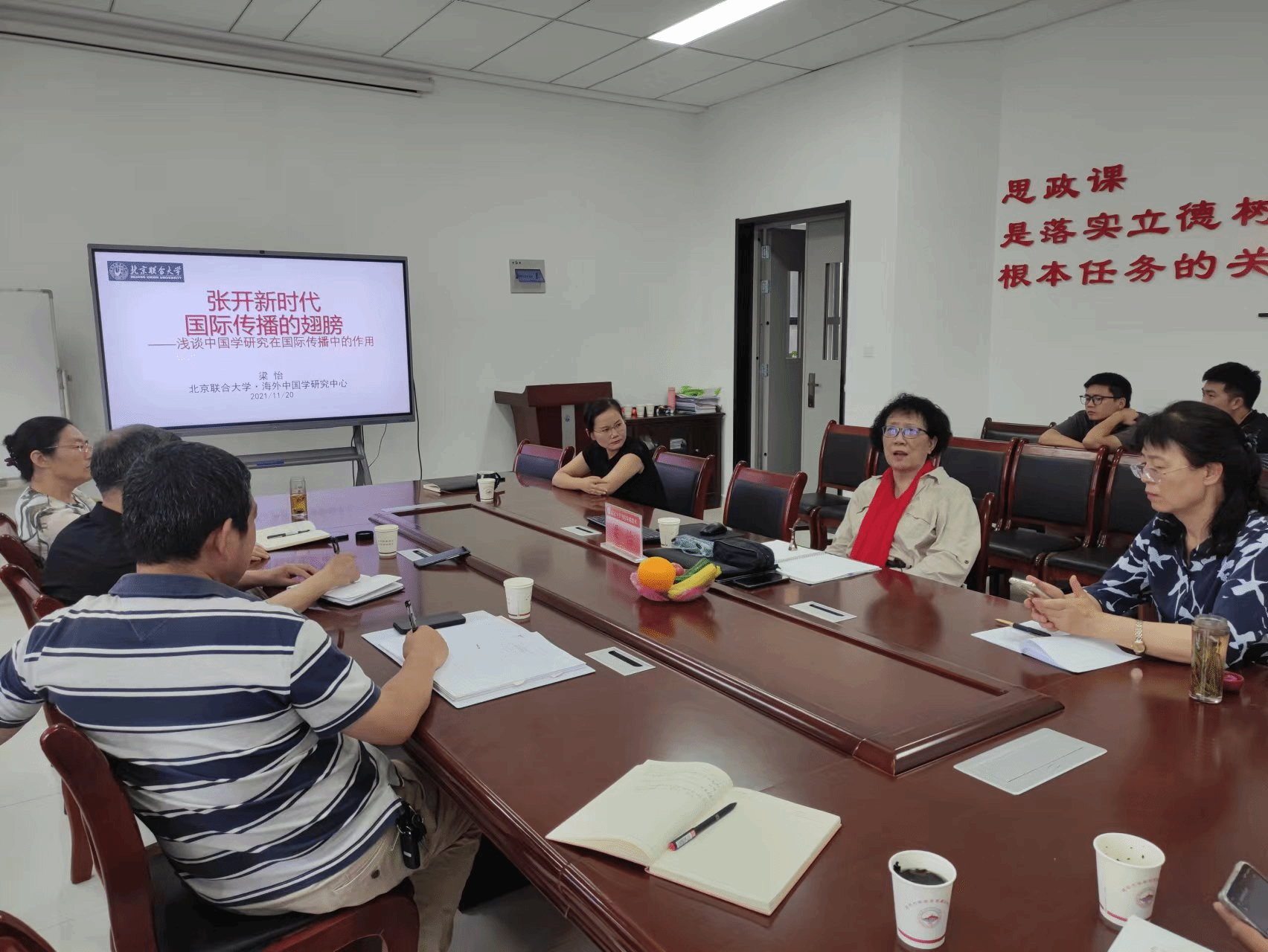 梁怡教授首先介绍了北京联合大学best365体育亚洲的团队建设和学科特色,然后对思政课教师的成长谈了几点想法,她认为思政课教师使命崇高、责任重大,要有政治素养、国际视野、能够从事跨学科研究、成为复合型人才,方能在思想上引领互联网时代的高校老员工,做好立德树人的本职工作。随后,梁怡教授以《张开新时代国际传播的翅膀——浅谈中国学研究在国际传播中的作用》为题作报告,结合自己的亲身经历给大家传授best365体育亚洲教师如何讲好中国故事的经验。参与座谈的各位老师与梁怡教授充分交流,表示受益匪浅。