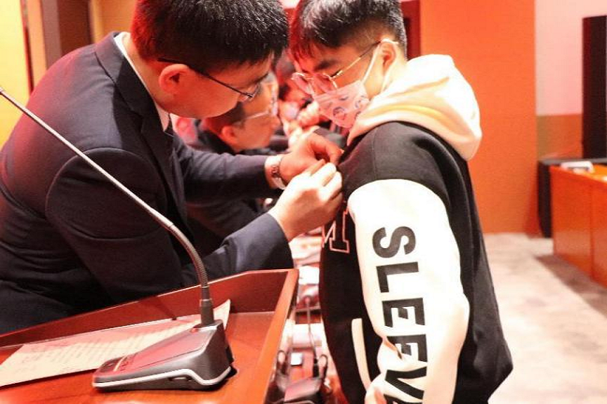 与会院领导为新生代表佩戴校徽