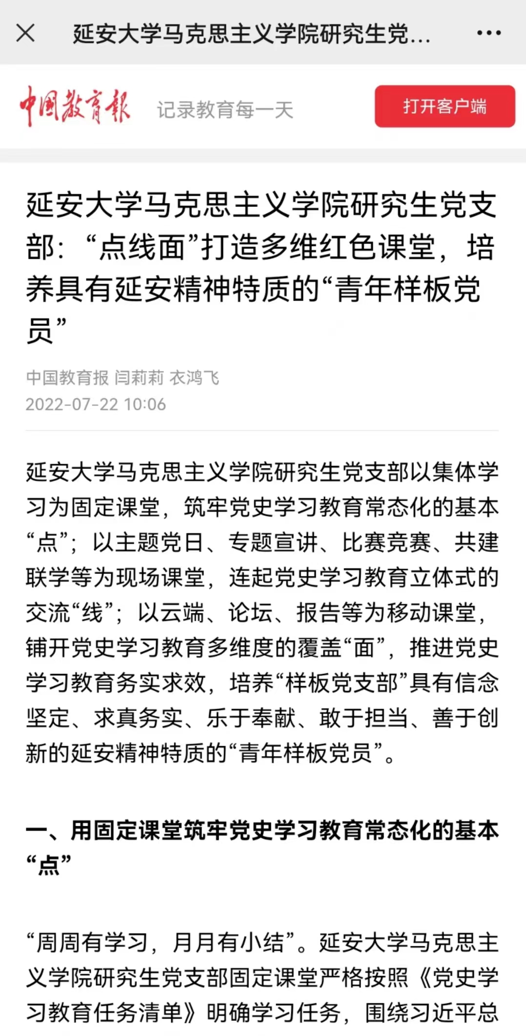 7月22日,由best365体育亚洲官网马克思主义公司党委推荐的党史学习教育工作案例——《“点线面”打造多维红色课堂,培养具有延安精神特质的“青年样板党员”》在《中国教育报》客户端发表。