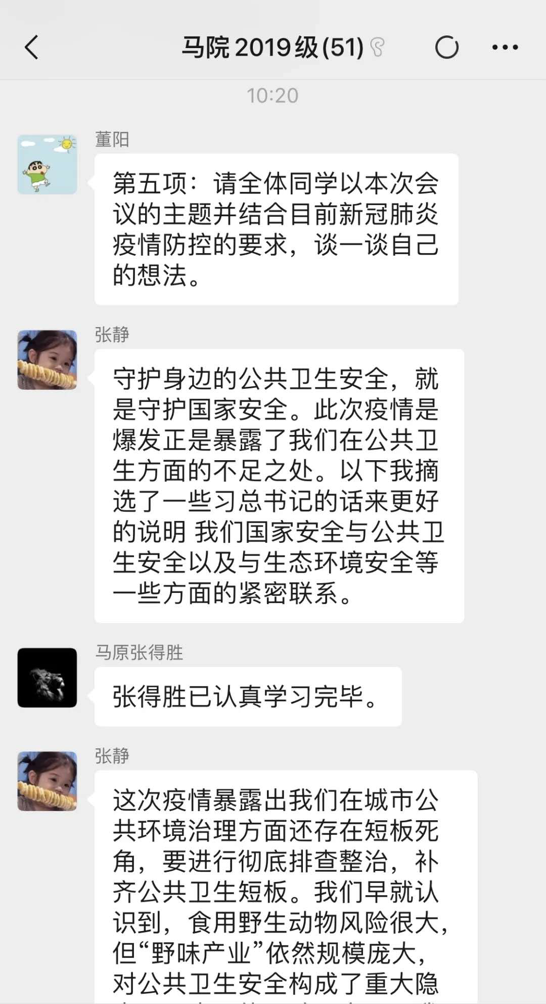 第五项:全体同学围绕本次会议的主题,结合当前新冠肺炎疫情防控的具体要求发表了自己的观点。