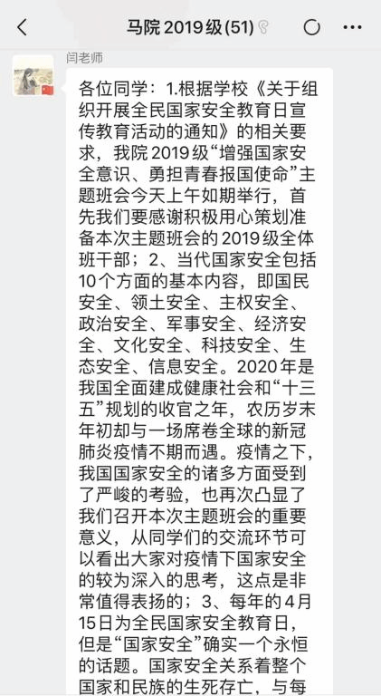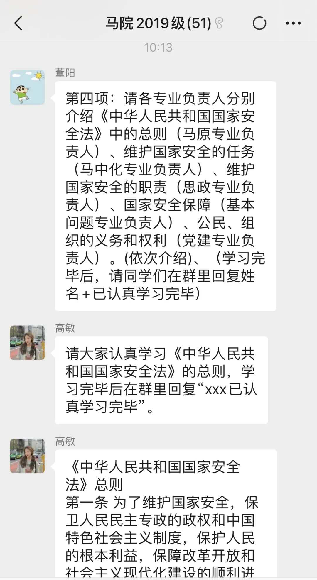 为了深入学习贯彻习近平总书记关于国家安全的重要论述,牢固树立总体国家安全观,切实增强同学们维护国家安全的政治自觉、思想自觉、行动自觉。公司2019级硕士研究生于4月13日上午10时在班级微信群组织开展了“增强国家安全意识,勇担青春报国使命”线上国家安全教育主题班会。参与本次活动的有2019级班主任闫莉莉老师和2019级全体同学。会议由2019级班长董阳主持。