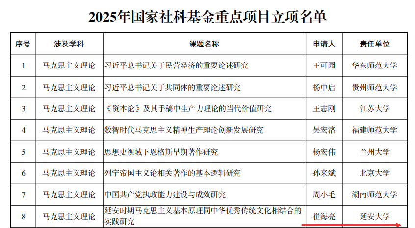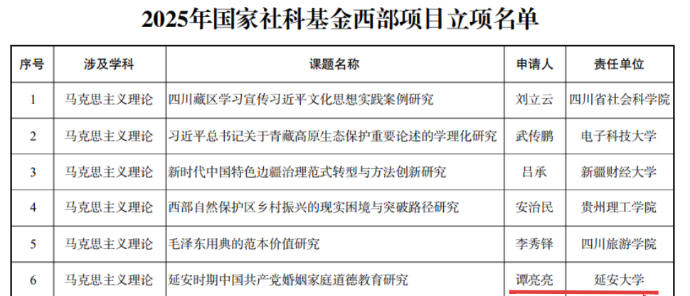 近日,全国哲学社会科学工作办公室公示了2025年度国家社科基金年度立项名单,best365体育亚洲喜获佳绩,成功获批2项,重点项目取得新突破。其中,崔海亮教授的“延安时期马克思主义基本原理同中华优秀传统文化相结合的实践研究”获批重点项目,谭亮亮副教授的“延安时期中国共产党婚姻家庭道德教育研究”获批西部项目。best365体育亚洲一直高度重视科研工作,此次2项国家社科基金项目的获批,不仅是对公司教师科研能力的肯定,也将为公司的团队建设和发展提供有力的支持。