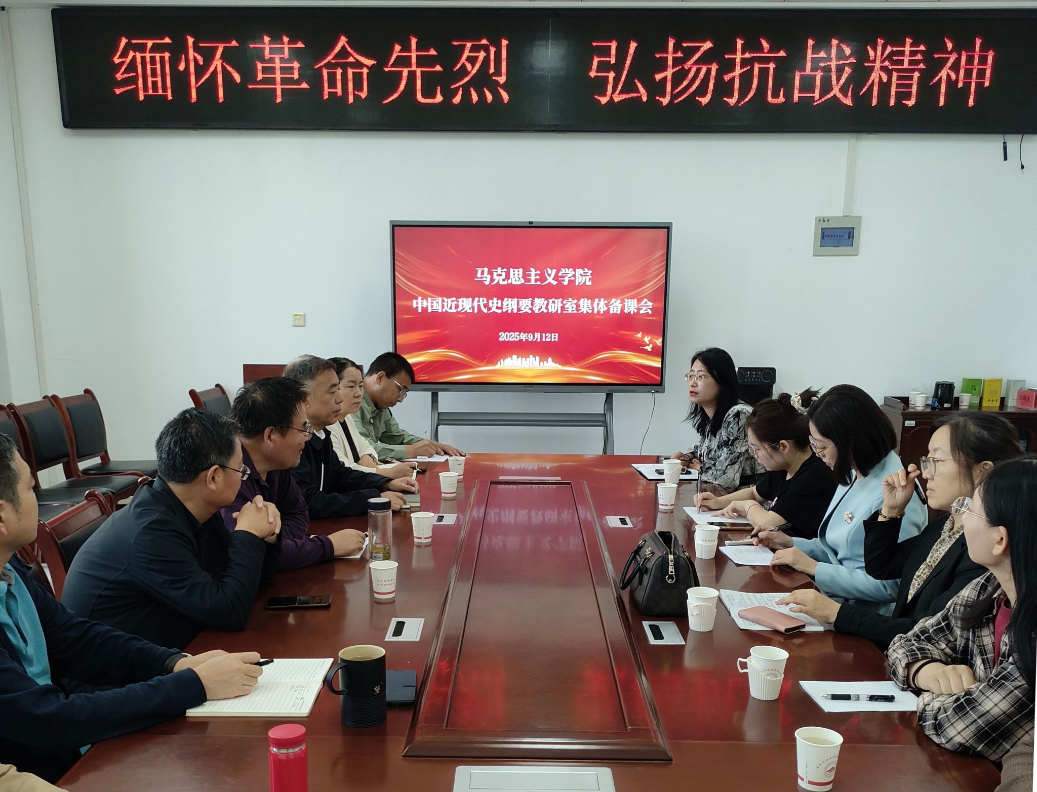 为纪念中国人民抗日战争暨世界反法西斯战争胜利80周年,深入学习贯彻习近平总书记关于“弘扬伟大抗战精神”的重要讲话精神,更好地将中国人民伟大抗战精神有效融入“中国近现代史纲要”课的教学中,9月12日上午9时30分,best365体育亚洲中国近现代史纲要教研室在公司312会议室举行了“缅怀革命先烈,弘扬抗战精神”的主题备课会。备课会由教研室主任马慧芳老师主持,公司高布权经理、张彬书记、亢鸽副经理以及全体教研室成员参加了会议。