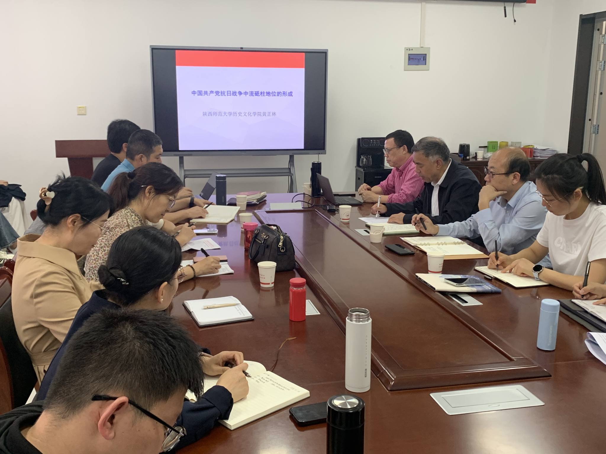 下午2时30分,教研室成员又聆听了公司特聘教授陕西师范大学黄正林老师所作的题为《中国共产党抗日战争中流砥柱的形成》的学术报告。黄教授从中国共产党力主抵抗日本侵略符合中华民族的根本利益、对抗日救国方针的探索和形成、中国共产党开创华北抗日战场的新局面、敌后战场成为中国抗战的重要组成部分等四个方面,论述了中国共产党中流砥柱作用的形成及发挥。黄正林教授的报告史料详实、论证充分,为教研室老师带来了一场精彩的学术盛宴,使老师们对抗日战争历史有了更加深入的理解和认识。