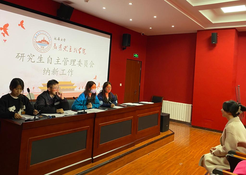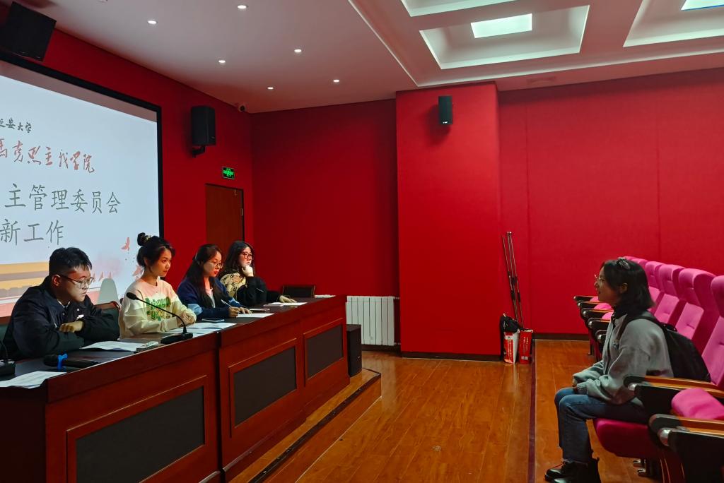 10月21日晚7:30,在5G思政实验室,由执行主席陈怀涛主持,主席团成员张元婕、杨圃;学术部负责人李彬羽;宣传部负责人薛凡;文体部负责人陈盼、王悦荷以及办公室负责人梁淑敏参会,对提交申请的46名同学进行了面试工作。