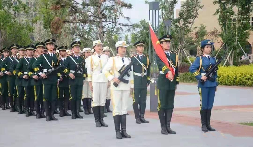 国旗护卫队迈着铿锵有力的步伐护送国旗走向升旗台。