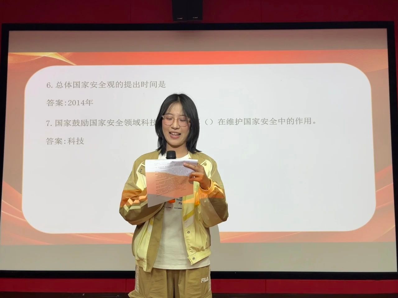 活动开场,主持人田紫涵围绕国家安全的重要性展开宣讲。她深入阐释国家安全的内涵与意义,着重强调“国家安全高于一切”,并号召同学们牢固树立总体国家安全观,主动学习国家安全法规,时刻警惕危害国家安全的行为,积极参与宣传教育活动,将理论知识与实际行动紧密结合,以青春之力守护国家安全,助力中华民族伟大复兴。