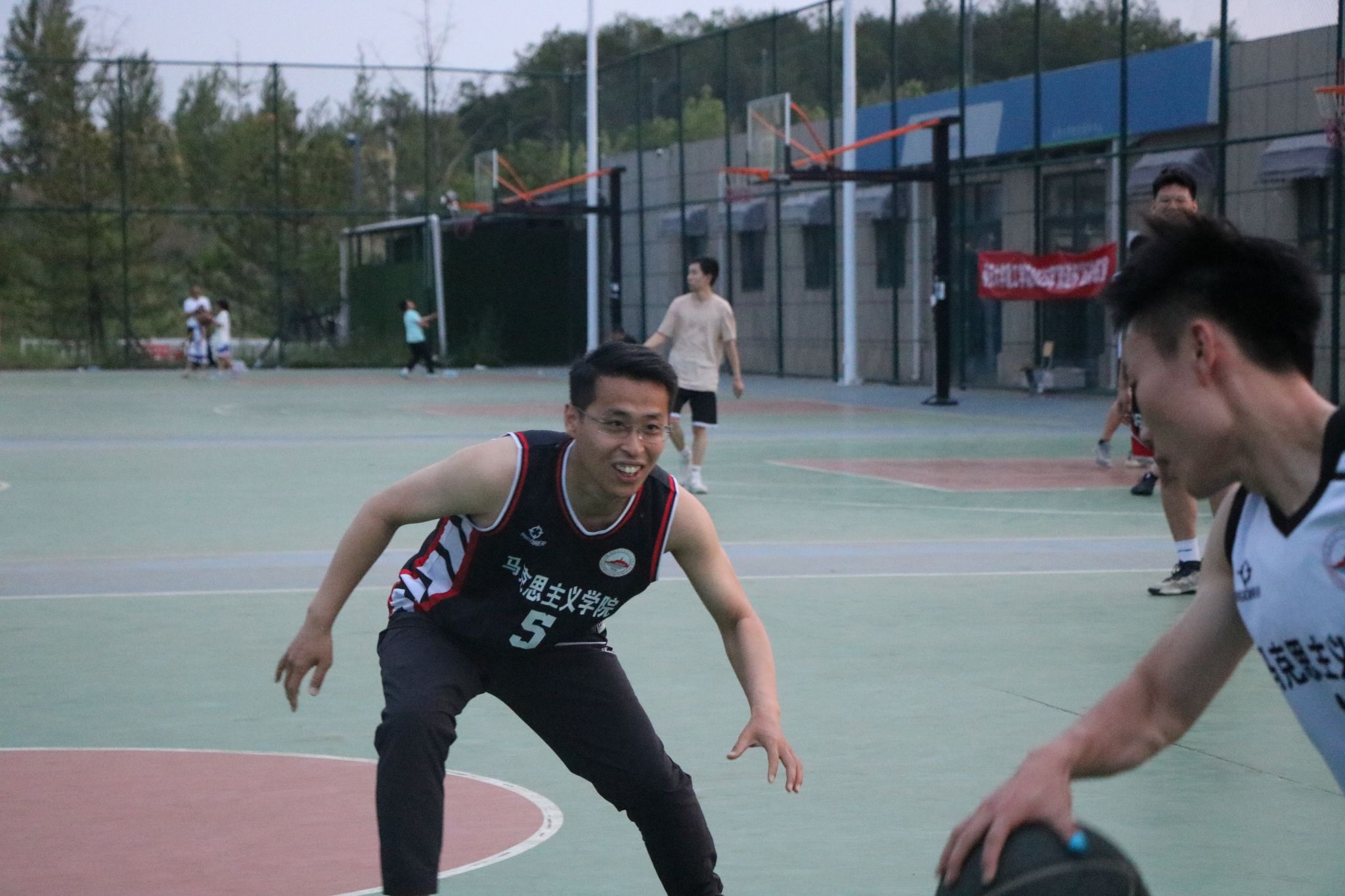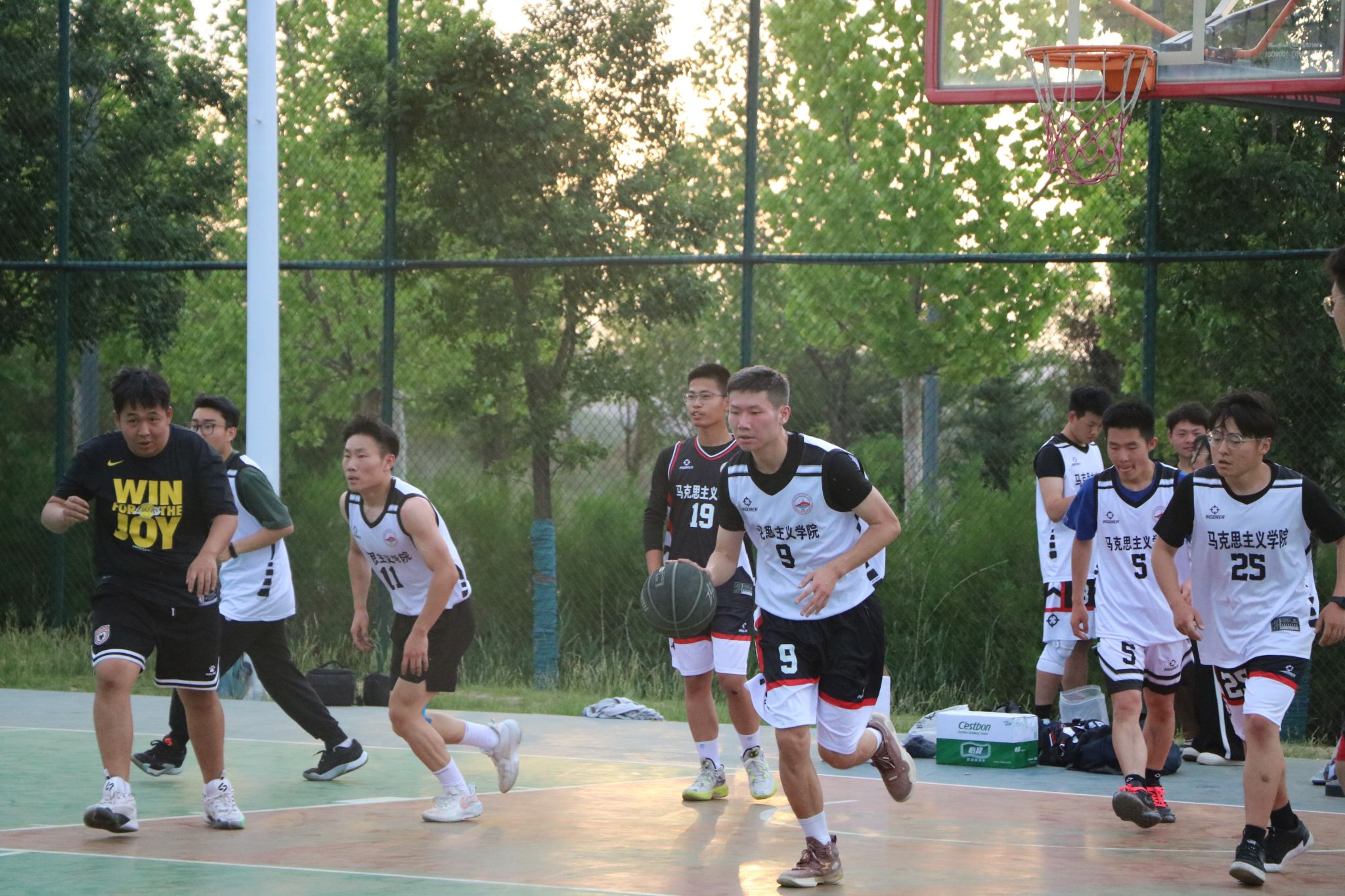 裁判员一声哨响,比赛正式开始。在篮球场上将球员们分为黑、白两队,我们可以看到双方队员们的高超球技。每一次运球,都融合了力量、速度与节奏;每一次传球,则体现了队友间的默契以及对于球场局面的把控;每一次投篮,不仅是力学与美学的完美结合,更是汗水与天赋的融合。双方那势如破竹的一次次进攻以及密不透风的防守都给我们呈现出了一幅幅视觉盛宴。球员们的奔跑、跳跃都是体力与意志力的生动诠释,在球场上对队员所说的那句“别慌”无不体现着关心与在意,球员们同心协力,相互支持共同努力为老员工活增添了浓墨重彩的一笔。最后郭忠義老师来到了篮球场上,穿上了球员的队服和球员们一起打球,他的到来使球场上一片沸腾,促进了师生间的美好交流共进。