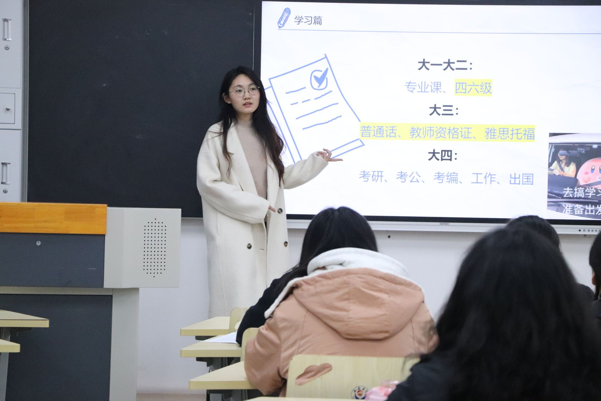 分享会上,李齐飞同学围绕“学习、工作、生活、规划”四大主题与同学们进行了经验交流。在学习上,她细致梳理了大学四年的关键任务,特别强调要善于利用碎片化时间进行记忆与复习。在工作上,她结合自身担任员工干部的经历,告诉同学们要找准学习与工作之间的平衡点。在生活上,她鼓励同学们积极与老师、同学和学长学姐交流,构建和谐融洽的人际关系网。在规划上,她提出要学会目标分解,比如大一打好基础、大二积累经验、大三明确方向,大四最后冲刺。