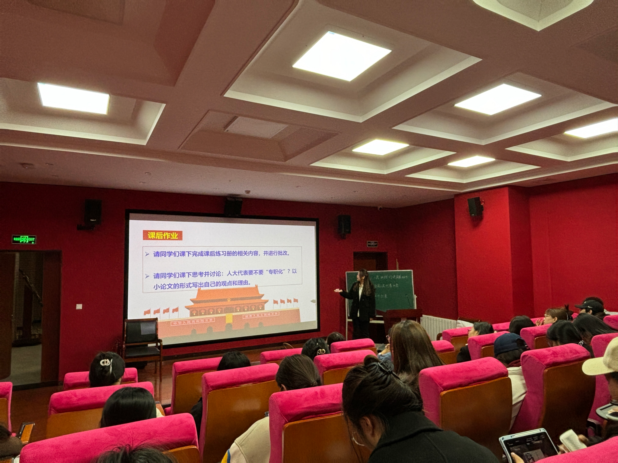 席巾捷同学试讲的内容是高中政治必修三的《人民代表大会:我国的国家权力机关》。她通过第十四届全国人民代表大会的议程引导同学们认识“人民如何行使国家权利?”,理解和区分全国人大和人大代表的地位和职权,以及感悟我国社会主义民主是维护人民根本利益的最广泛、最真实、最管用的民主。试讲结束后,在教师评价环节中,谢延秀老师和袁芳老师就“怎样可以更有趣更适当的新课导入问题”进行了探讨,提出了课堂最终应落实到对员工的价值引领上,课堂的内容应回归中国特色社会主义民主,与中国特色社会主义民主相联系。
