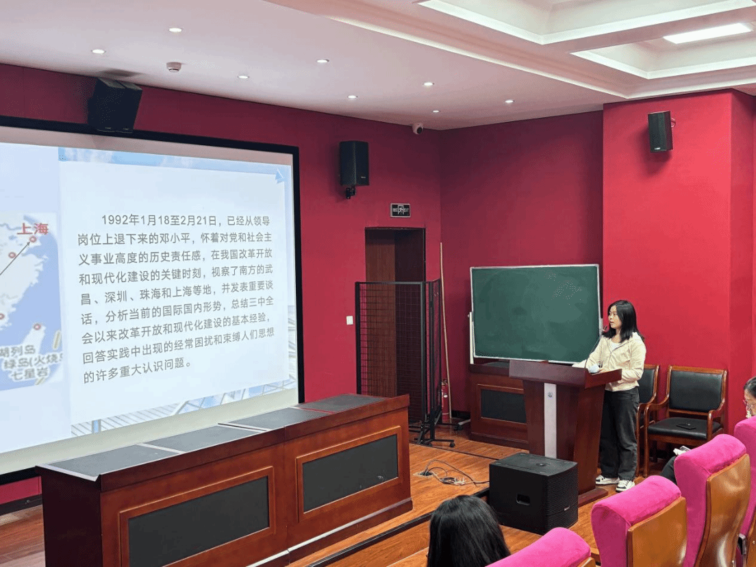 第一位童倩同学导读的是《邓小平文选第三卷》中的《在武昌、深圳、珠海、上海等地的谈话要点》。她从写作背景、主要内容、重要意义和心得体会四个方面展开分享。首先,她指出这篇文章是在国内外政治形式的影响下,一些人对改革开放产生怀疑的情况下,邓小平视察南方发表的重要讲话。其次,分两个方面介绍本文。一是文章的主要内容:革命是解放生产力,改革也是解放生产力;改革要加快步伐,提出“三个有利于”标准;发展才是硬道理;两手抓,两手都要硬;正确的政治路线要靠正确的组织路线来保证;坚持社会主义信念。二是文章的一些原创性贡献:提出社会主义的本质;正式提出社会主义市场经济理论;马克思主义是打不垮的;中国的事情能不能办好关键在人。她指出,这篇文章对于推进马克思主义中国化时代化具有重要意义,要学习其中的重要观点、理论,继续在建设有中国特色的社会主义道路上前进。最后,她从所学专业出发,讲了自己读完这篇文章的心得体会。
