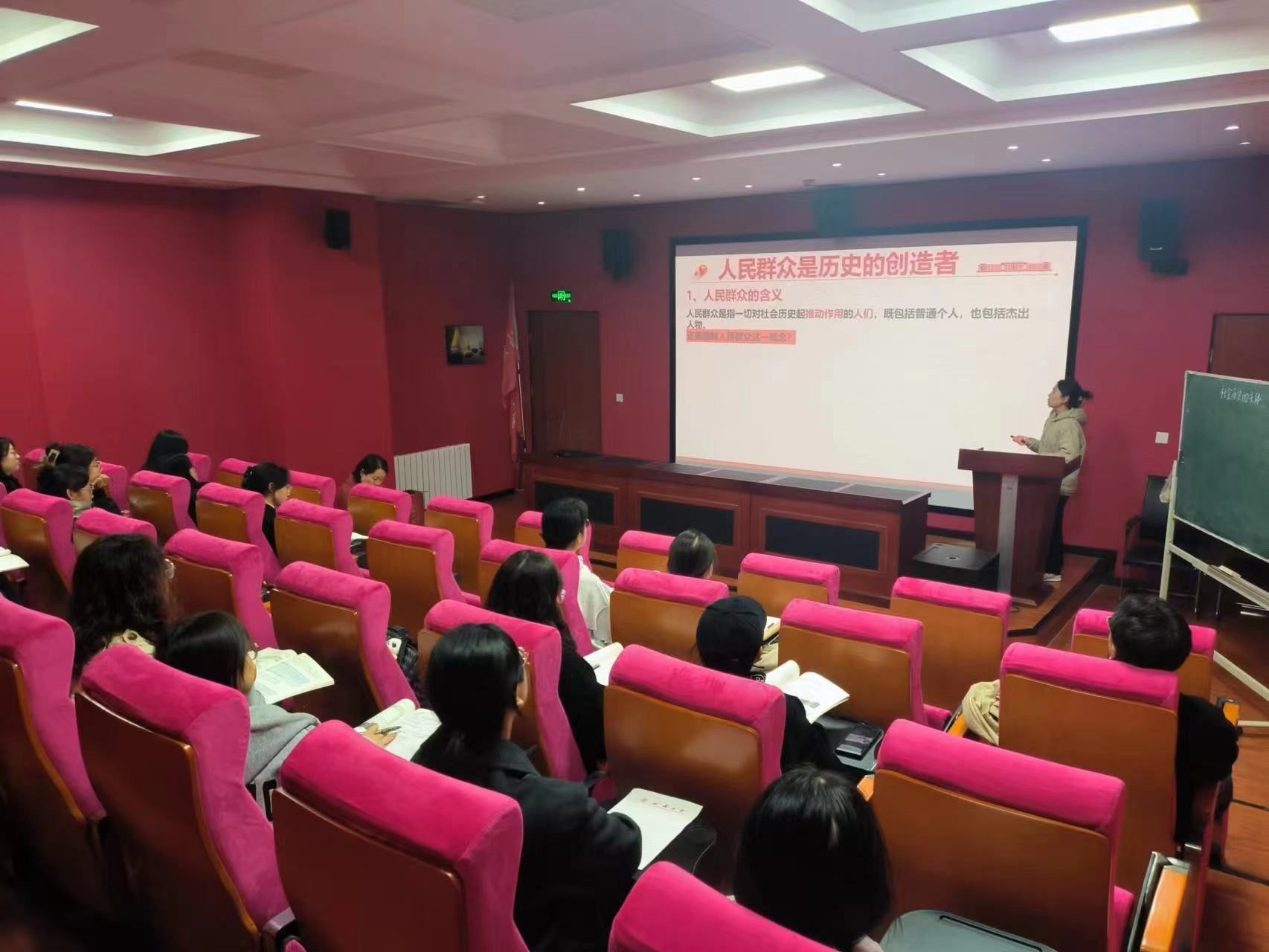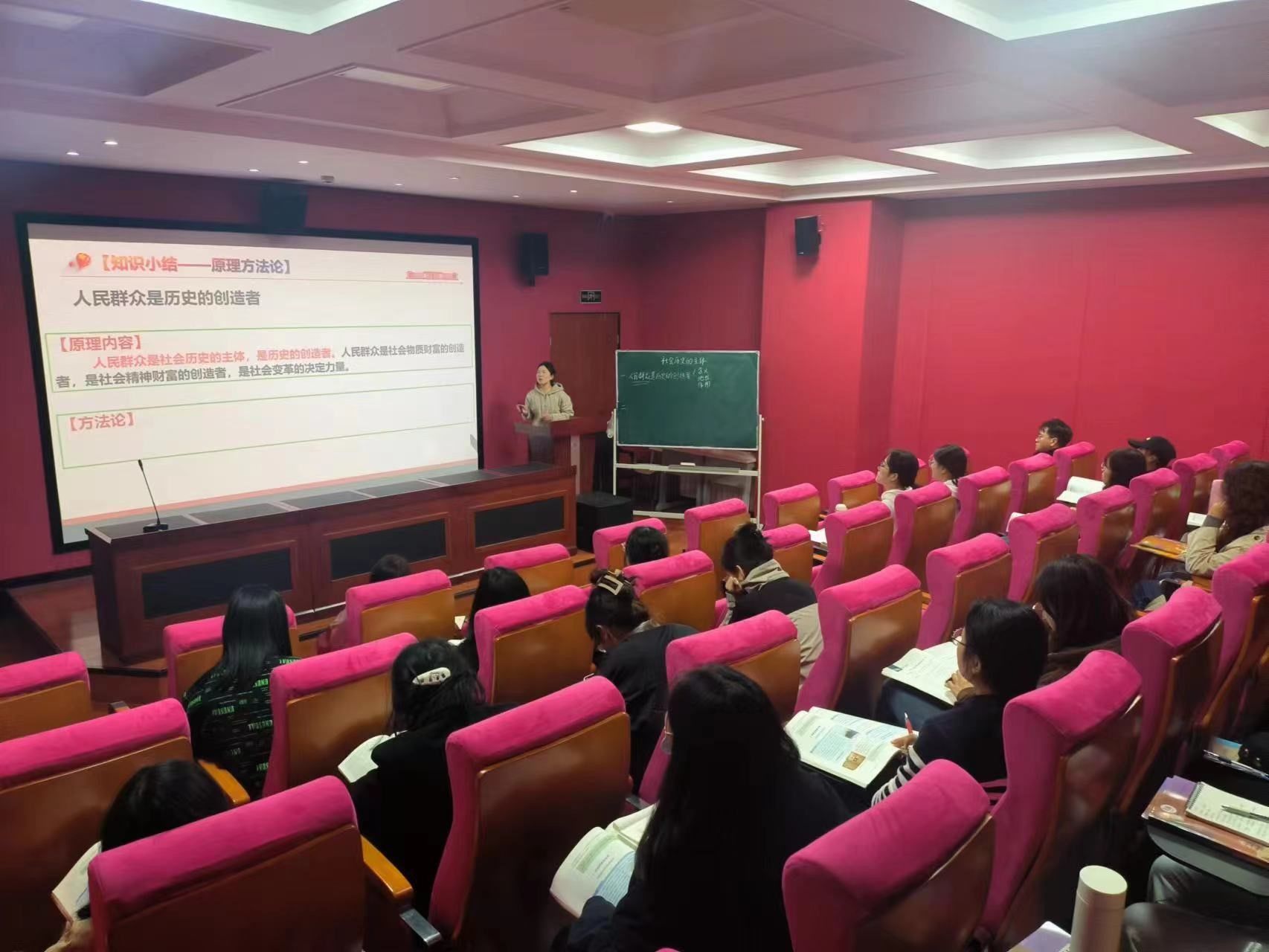 白雪同学试讲的是高中政治必修四的《社会历史的主体》。本框内容体现以人为本、关注民生的哲学基石。依据新课标,结合教材内容结构和员工认知结构,利用多媒体展示史实,设置相应问题让员工思考、讨论、探索,引导员工正确认识人民群众的含义、地位、作用,熟练掌握群众路线与群众观点的内容、地位、意义、时代要求。试讲结束后,在教师评价环节,亢鸽老师就案例素材的优化等问题进行分析,并指出不足之处,还提出在今后教学中应努力将思政课上成“有温度的课”。