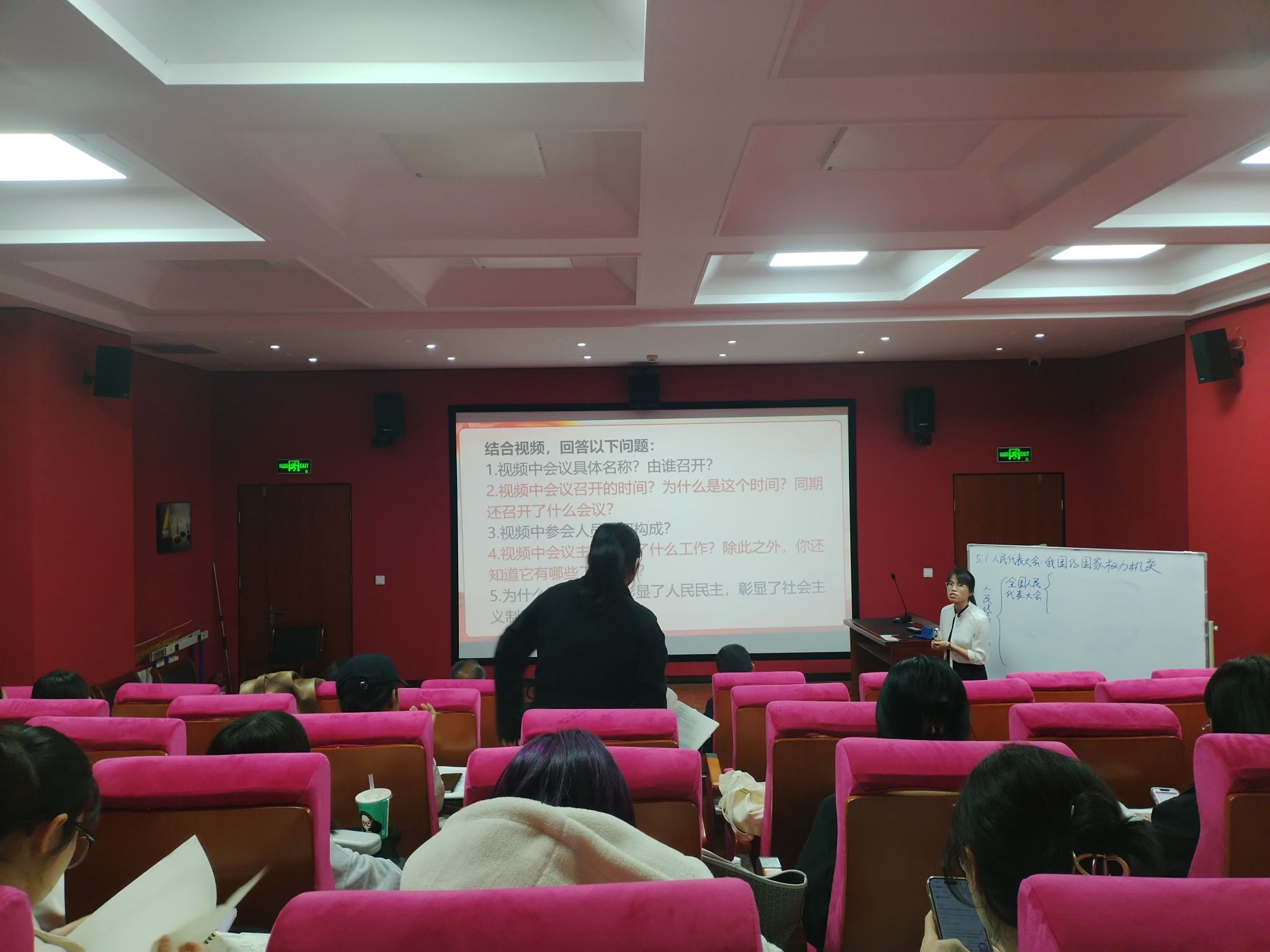 武婷婷同学试讲的是必修三“政治与法治”第五课第一框《人民代表大会:我国的国家权力机关》的内容,在讲课中紧紧围绕“人民代表大会”和“人大代表”两个主体展开教学。课堂主要分为“人民如何行使国家权力?”和“人大代表如何代民履职?”两个子议题,通过聚焦两会、人大风采、人大履职经历三个视频进行学习,展开热烈讨论,在与员工们的互动中掌握知识,领会精神。课后,老师们就“全国人民代表大会召开时间”如何讲解展开讨论交流,对 PPT 制作方面给予针对性的指导,同学们表示受益匪浅,收获颇丰。