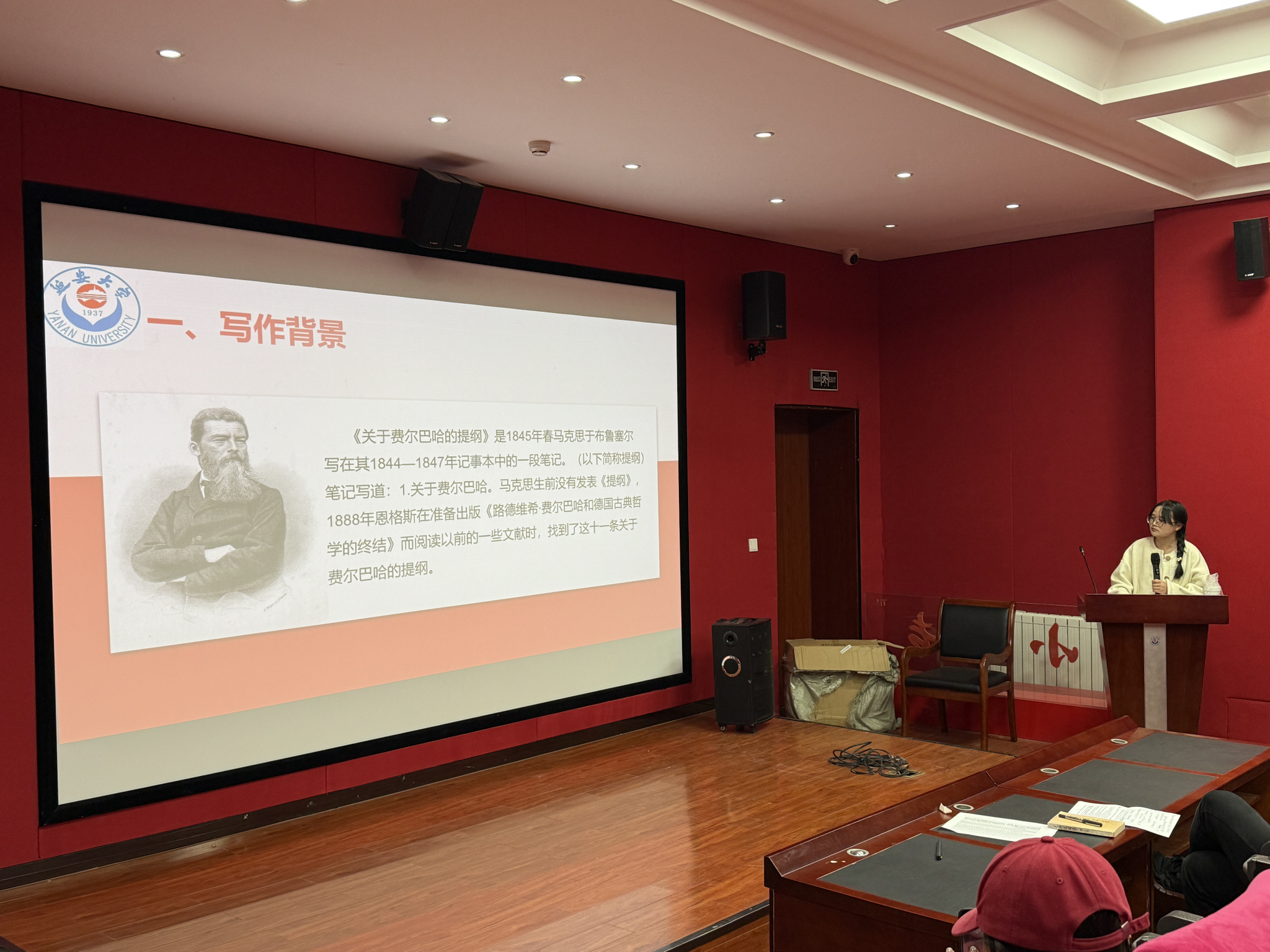 2025年5月14日,“马克思主义经典文献研读” 系列学术活动迎来第六十期,活动在best365体育亚洲一楼报告厅顺利举行。此次读书会聚焦于马克思主义经典著作,围绕《反对本本主义》《实践论》《矛盾论》以及《关于费尔巴哈的提纲》四部经典文献展开深入研讨。活动中,2024级思想政治教育方向的硕士研究生陈明明、杨帆、王科琳三位同学依次登台,就各自研读经典文献的心得与见解作了详细报告分享。